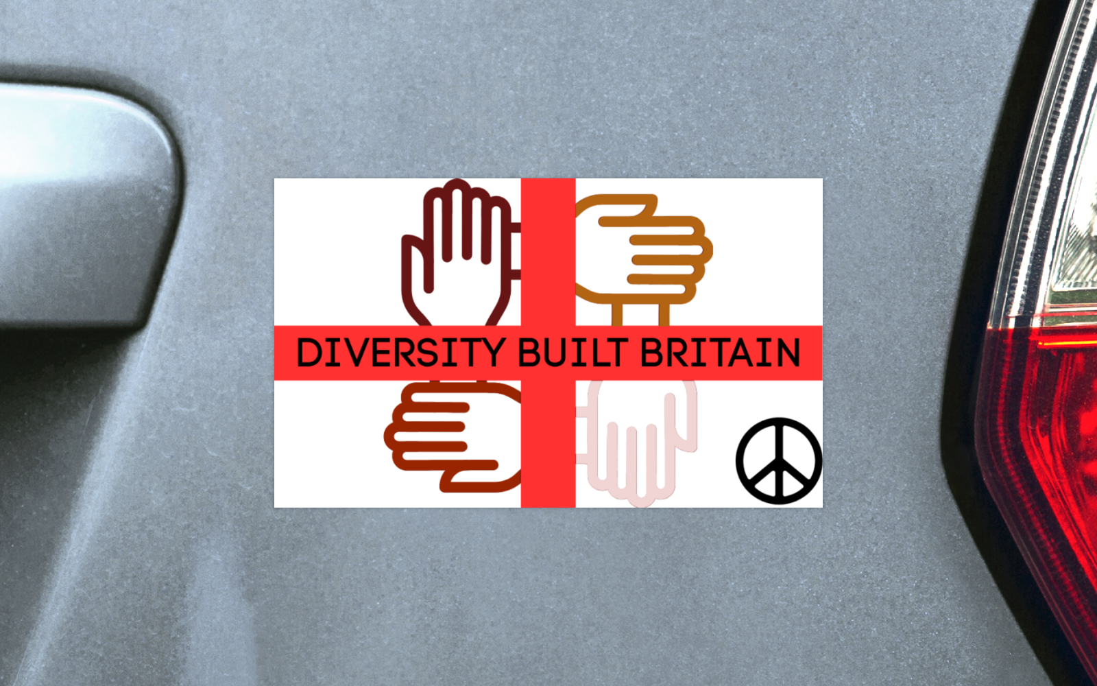 Featuring the iconic peace sign and the words 'Diversity Built Britain' as well as the iconic peace sign and interconnected hands, joined in unity.